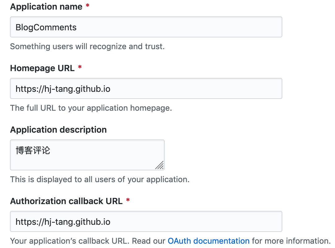 点击此处 来注册一个新的 OAuth Application。或者点击GitHub右上角个人头像 -> Settings -> 左侧最下的Developer Settings -> OAuth Apps -> New OAuth App。Application name可以随便填,Homepage URL和callback URL最好都填你的博客域名,如我的填的就是https://hj-tang.github.io。注意!域名后面不要有斜杠 / !!